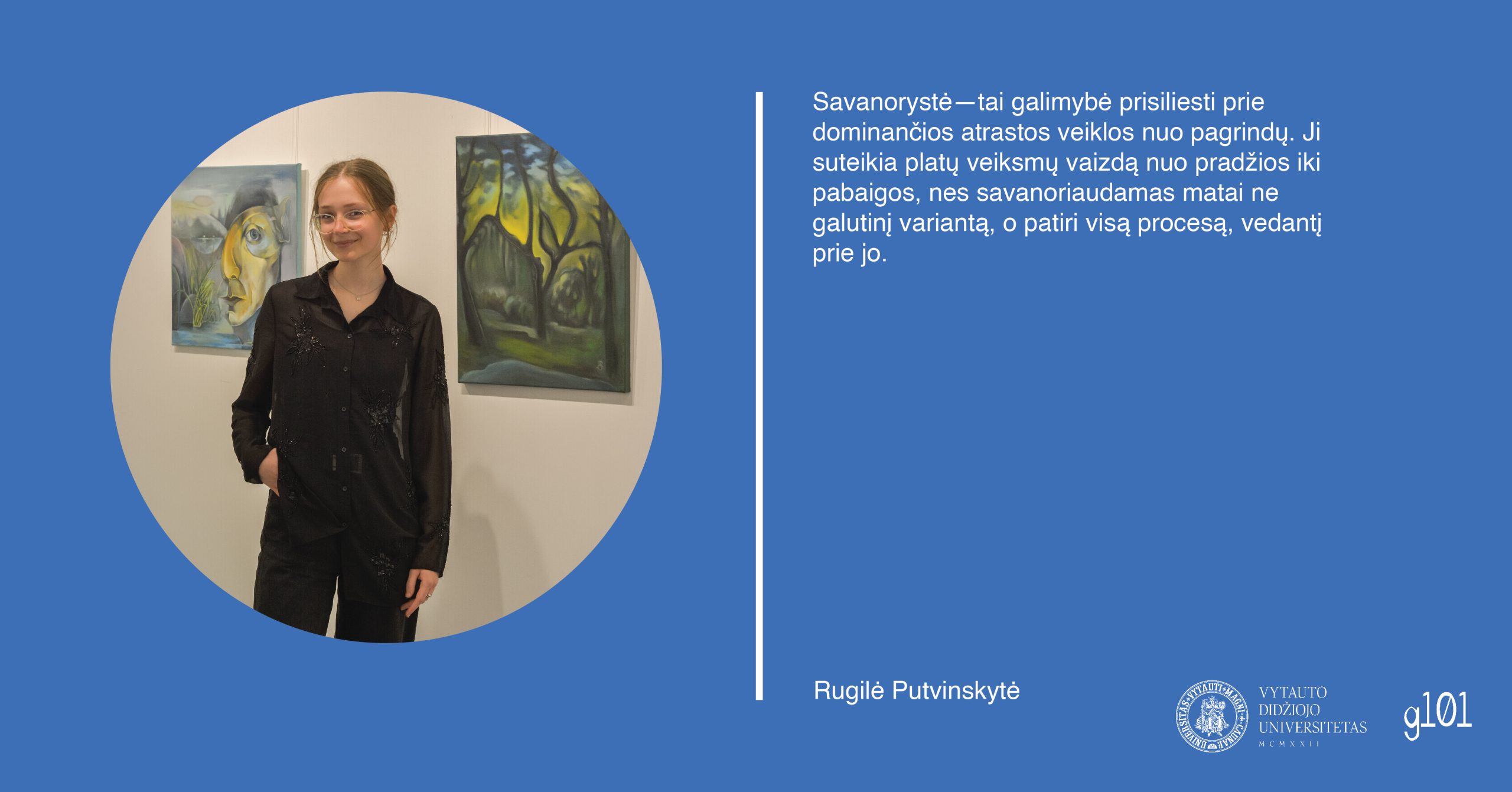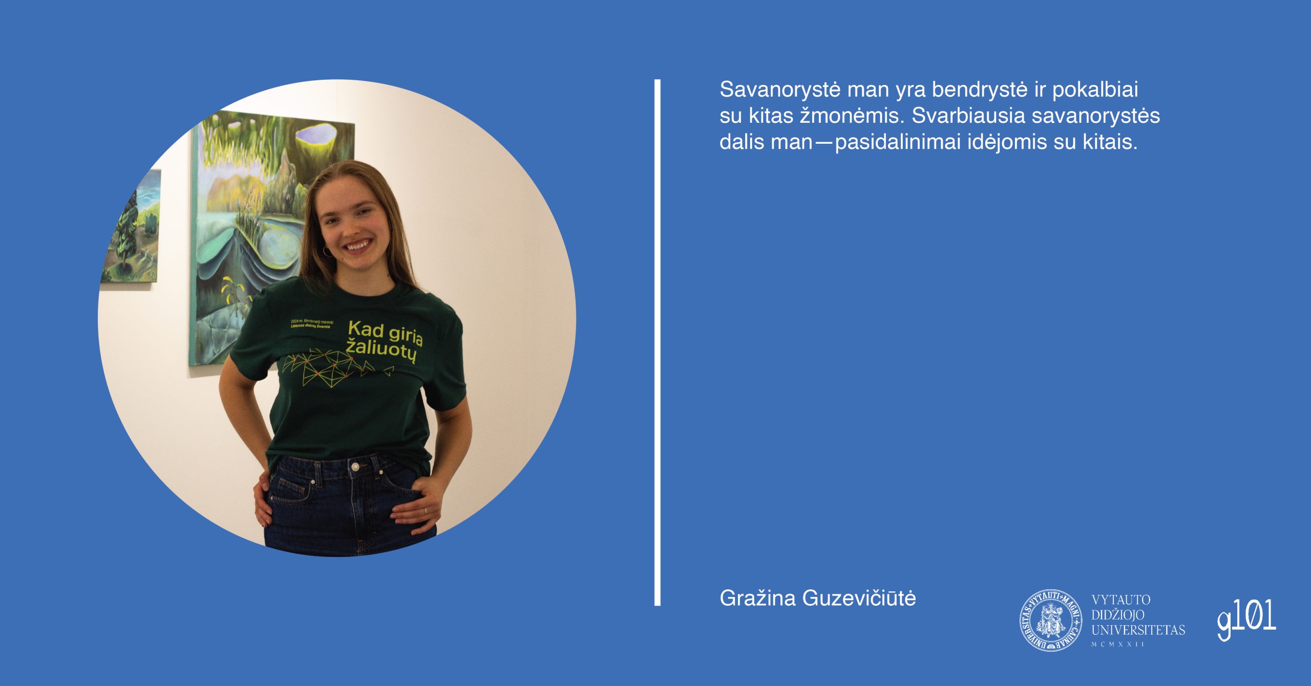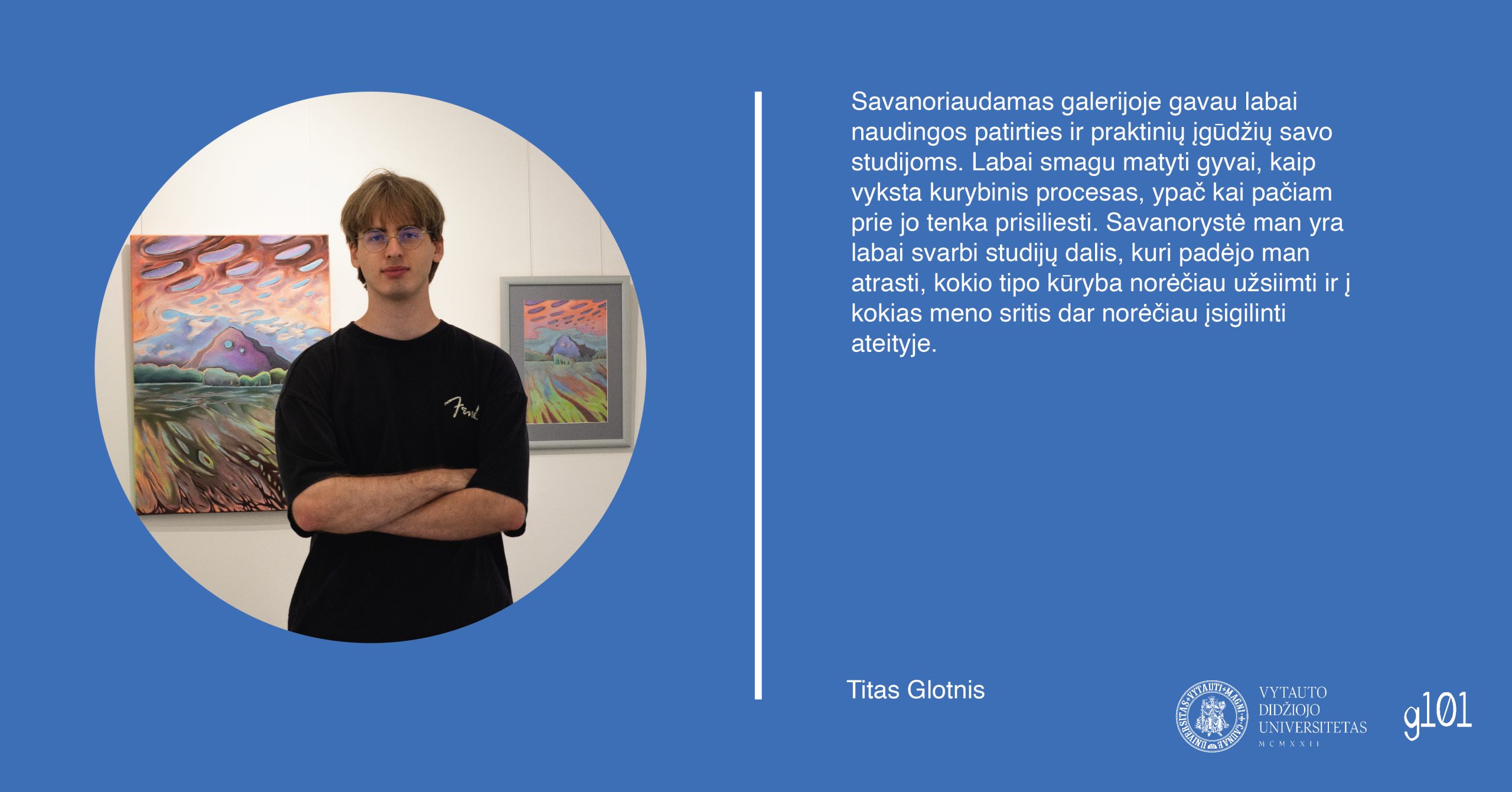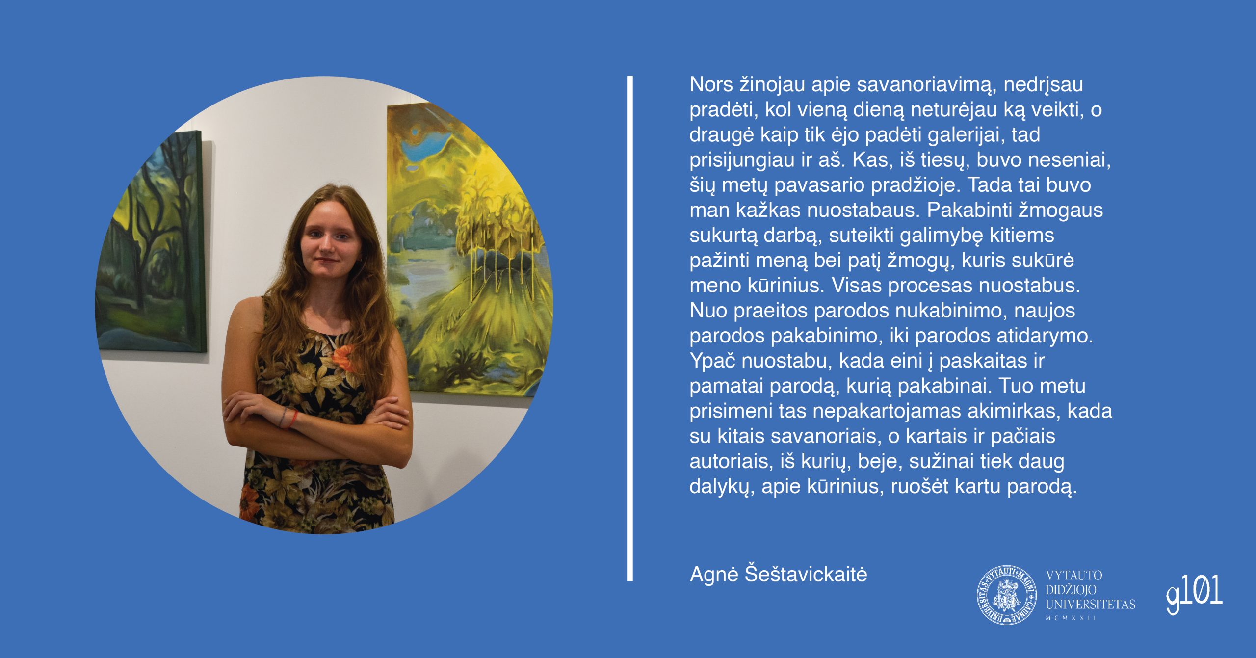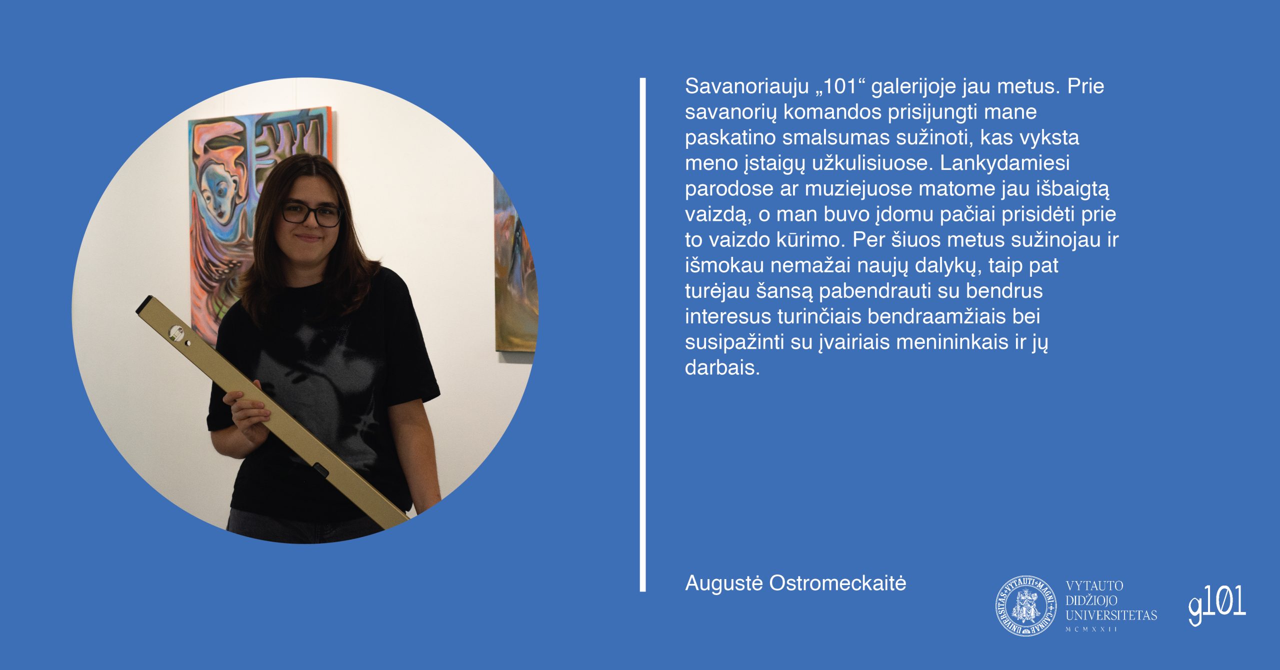 VDU menų galerijos „101“ praktikantė, kelerius metus savanoriaujanti galerijoje Gabrielė Marija Valaitytė, kviečia susipažinti su galerijos savanoriais ir jų mintimis!